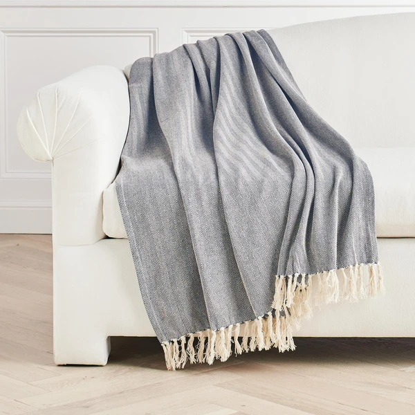Crafted of cotton with a chevron design and knotted fringe, this lightweight throw adds texture and charm to any space.