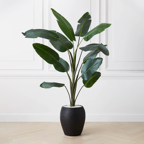 Housed in a black pot, this lifelike banana palm plant brings a splash tropical flair to the scene.