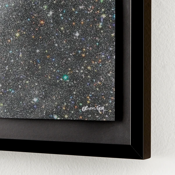 - Pedestal-mounted art print set off against a black mat and crystalized with a fine diamond dust finish.