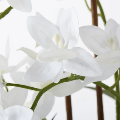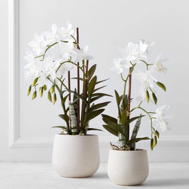 Housed in a speckled white pot, this stunning display of faux orchids will look lush and lifelike all year long.