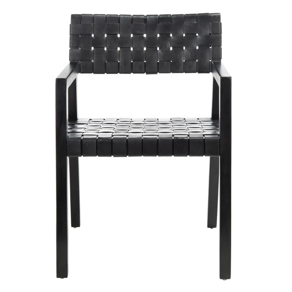 With its angled mahogany framework, woven leather seat, and black finish, this chair brings sleek, contemporary style and comfort to the dining room.