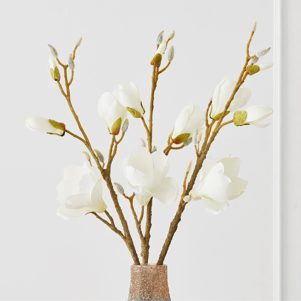Faux white magnolia blossoms look entirely lifelike with textured natural stems. Zero maintenance required.