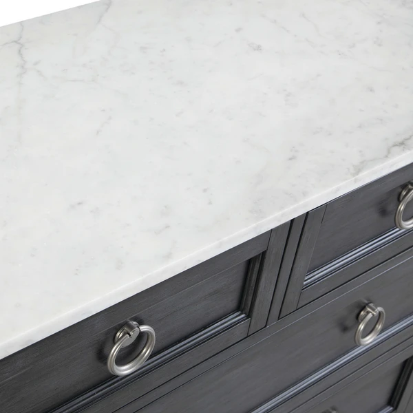 The Finnian collection features modern contemporary styling with high constrasting black and white finishes. The genuine marble table top sits on a brushed graphite, black wood frame. The white and gray marbling compliments the nickel footcaps..