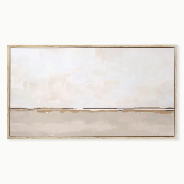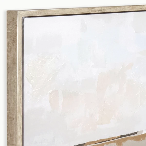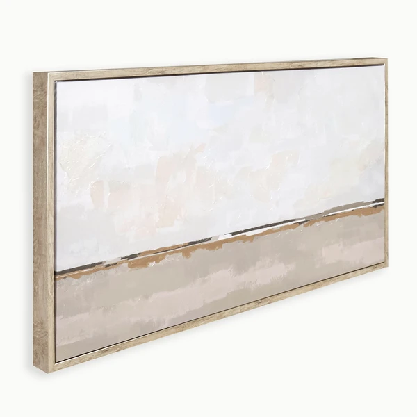 Flatland is a gallery wrapped canvas with hand-applied pallet knife embellishment and set in a light wood and champagne (2-tone) floater frame.