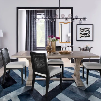 With its clean-lined silhouette and matte black finish, our Graham chair brings a sophisticated, modern look to the dining room, while its cane back adds a dash of timeless charm. Shown in Kenley Chenille Canvas.