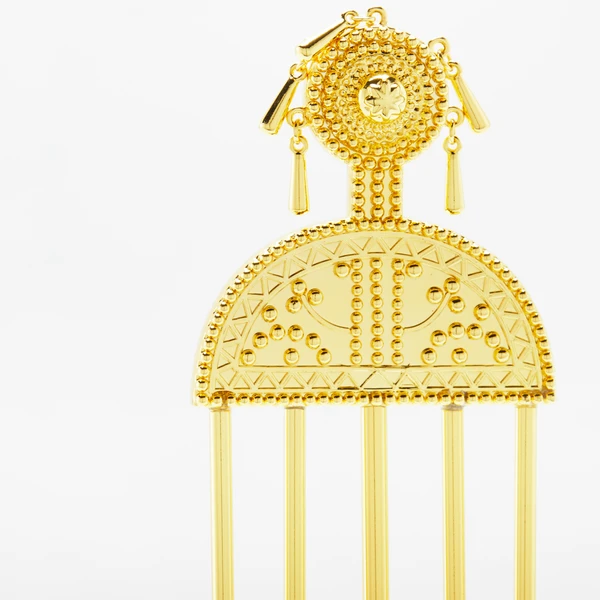 Supported by a clear acrylic base, this golden hairpin brings impressive texture and visual appeal to any console, mantel, or shelf.