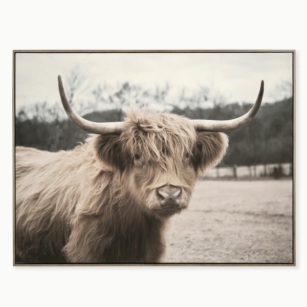 Hank is a gallery-wrapped canvas set in a natural wood tone floater frame.