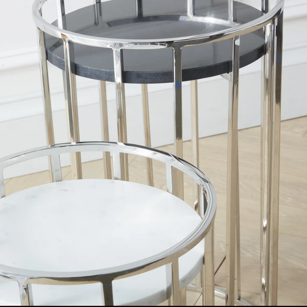 Sleek and modern, these accent tables are each designed with an open stainless steel base finished in gleaming silver. The larger table is topped in black marble and the smaller table is topped in white marble for a high contrast, cohesive look.
