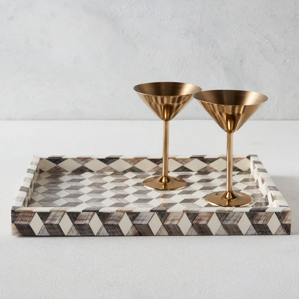 Featuring a mosaic of natural horn and resin tiles arranged in an eye-catching geometric pattern, this tray is a luxe option for grounding a tabletop vignette.