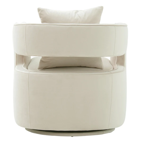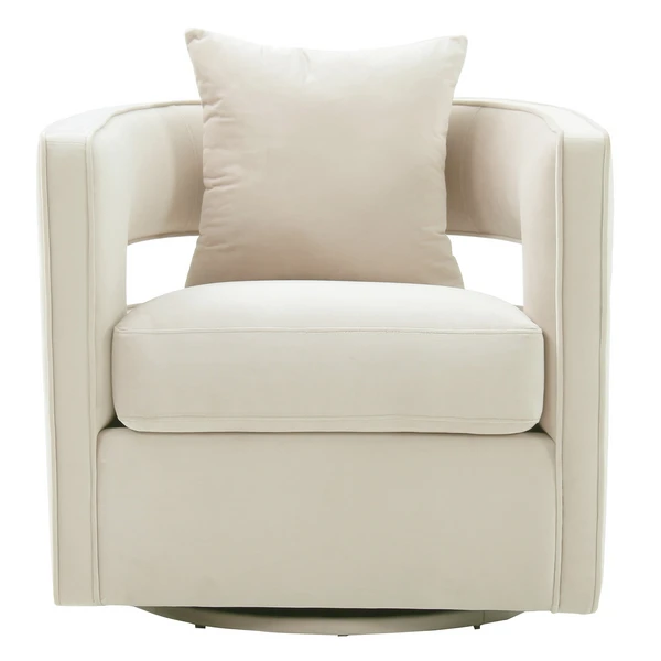 With its barrel back, cutout arms, and Cream velvet upholstery, this swivel chair adds instant glamour to a room. A kiln-dried frame and plush foam-and-fiber fill ensure long-lasting comfort and support.