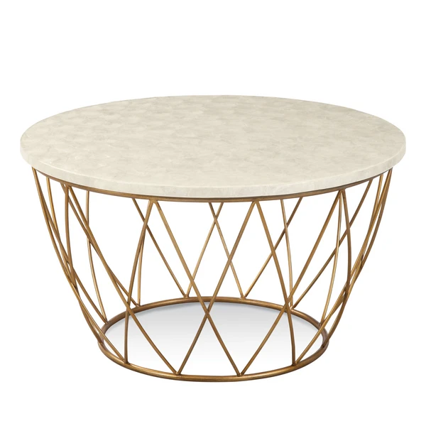The Mara Round Coffee Table has a beautifully crafted Capiz top and metal base in gold finish.