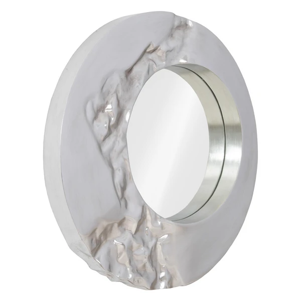A stylish focal point for any room, this wall mirror flaunts a round silhouette and otherworldly composite frame with a fluted, asymmetrical design and gleaming silver-leaf finish.