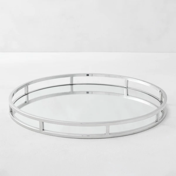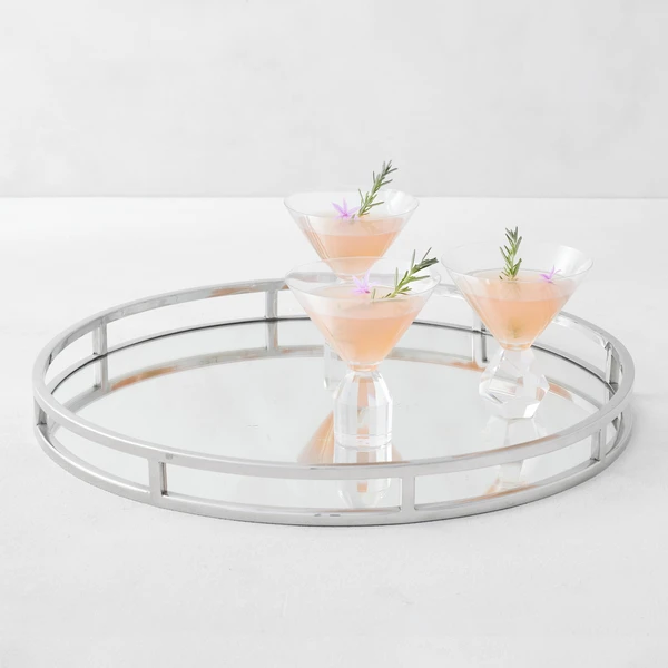 Sleek and contemporary, our Metropolitan Tray offers a round shape with modern appeal and high style to arrange your libations on. The tray’s ample surface is lined with mirrored glass and a sturdy stainless steel rim runs along the perimeter, making it effortless to wait on your guests with style.