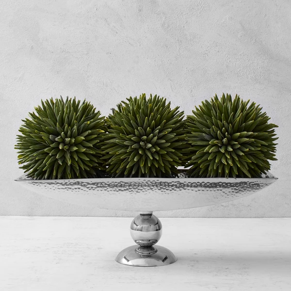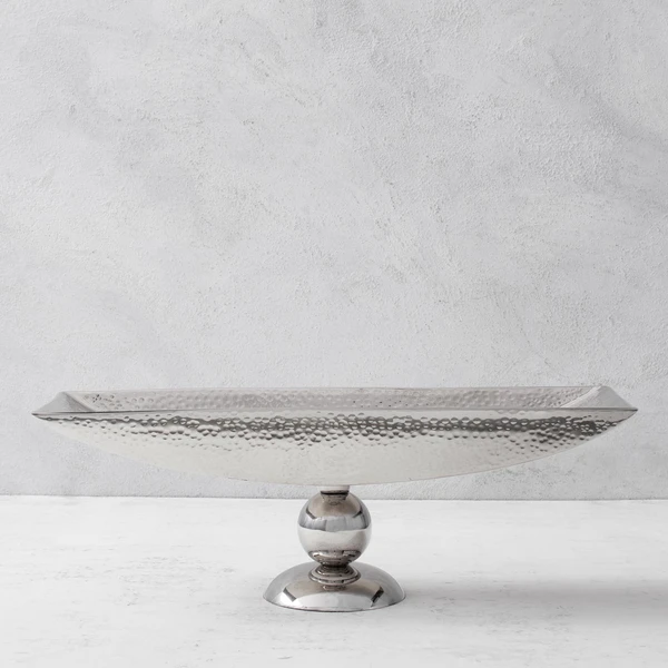 An elegant addition to a console or tabletop display, this centerpiece features an elongated, hammered silver-finished bowl perched on a sleek pedestal base.