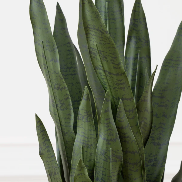 A visually stunning and stately faux arrangement featuring Mother in Law’s Tongue in a woven blue and tan basket.