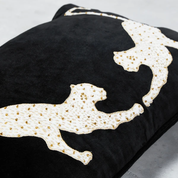 The Nikki Chu Agu Pillow is a playful addition to your space. Featuring front and back piping, the 14″ x 22″ throw pillow depicts two ivory cheetahs on a black velvet background. Removable insert is included.
