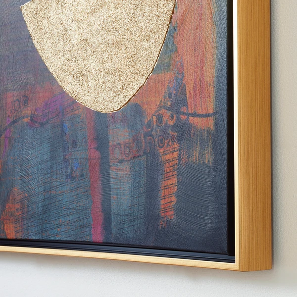 Printed on canvas with hand-applied impasto gold embellishments and set in a gold frame, this striking work from Nikki Chu lends a modern mood and vibrant color to the wall.