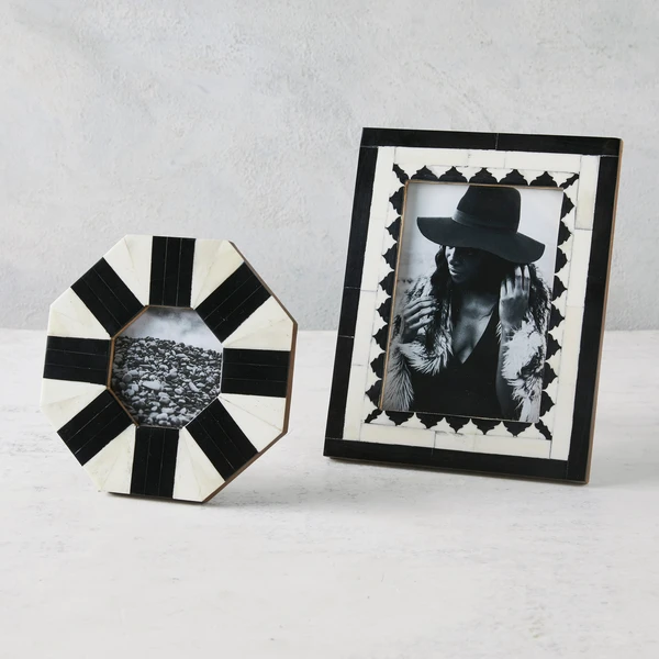 Featuring a mosaic pattern of black and white tiles, this picture frame is a stylish option for displaying your favorite photo. Pair with our Ollie Frame for double the impact.