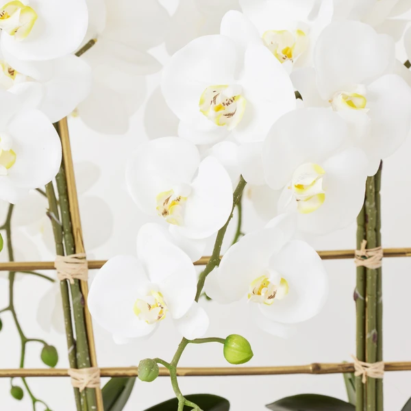 Introducing a show stopping centerpiece, this premade faux floral arrangement captures the essence of elegance with its lush orchids blooming in opulent gold pots, showcased atop a sleek granite slab, creating a captivating focal point for any space.