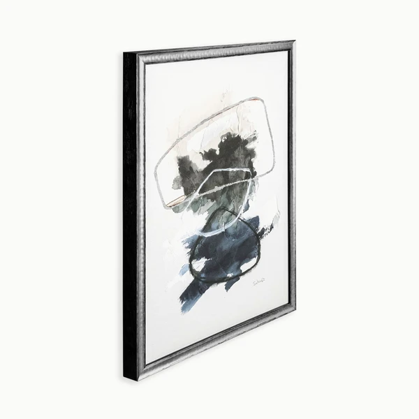 Overlap is a gallery wrapped canvases with hand-applied pallet knife embellishment and set in black with hammered silver (2 tone) floater frames. Set of 2.