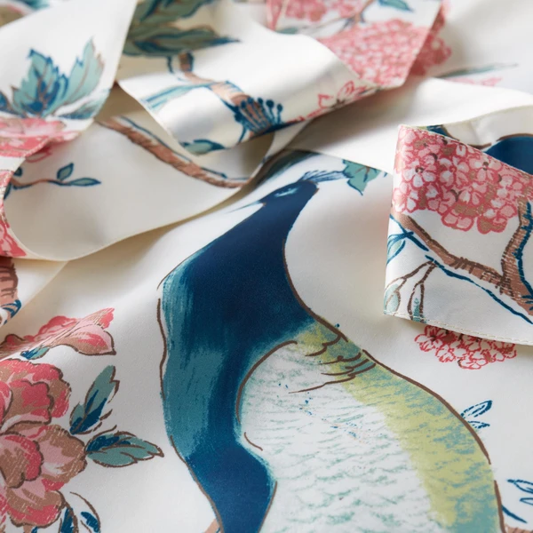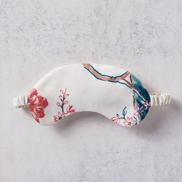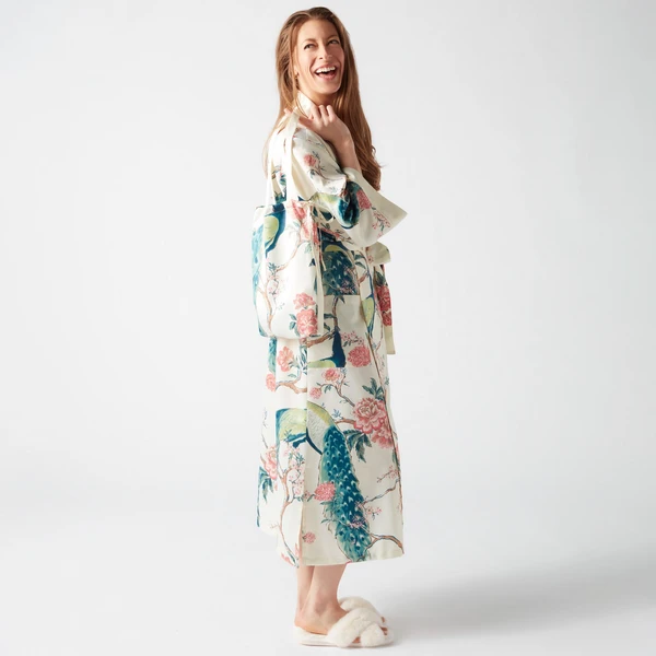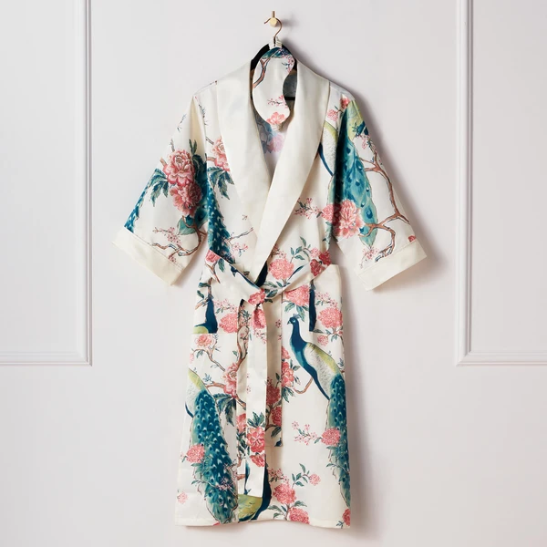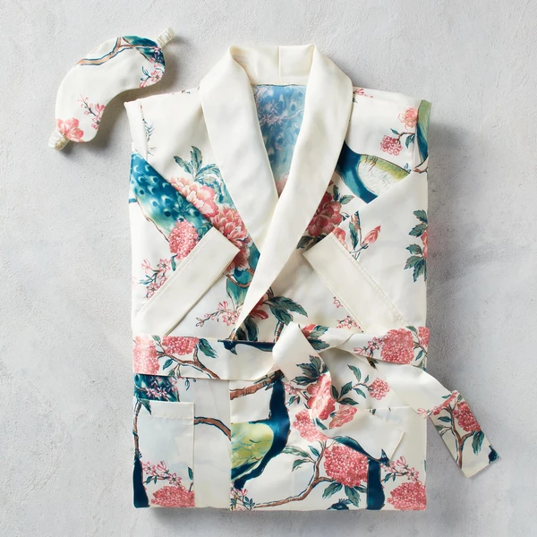 Lounge in style with this silky soft robe-and-eye-mask set, artfully adorned with blooming branches and perched peacocks.