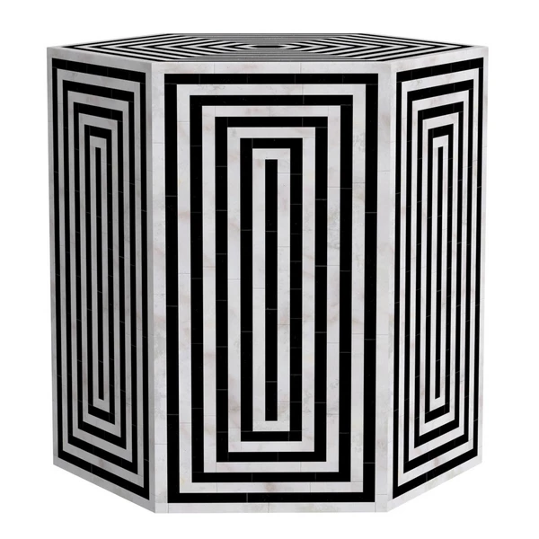 The Rita Accent Table is hexagon in shape with alternating pattern of black and white bone.
