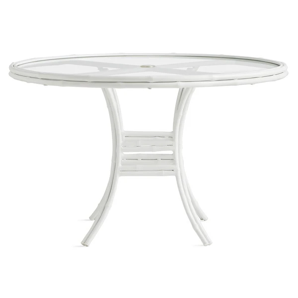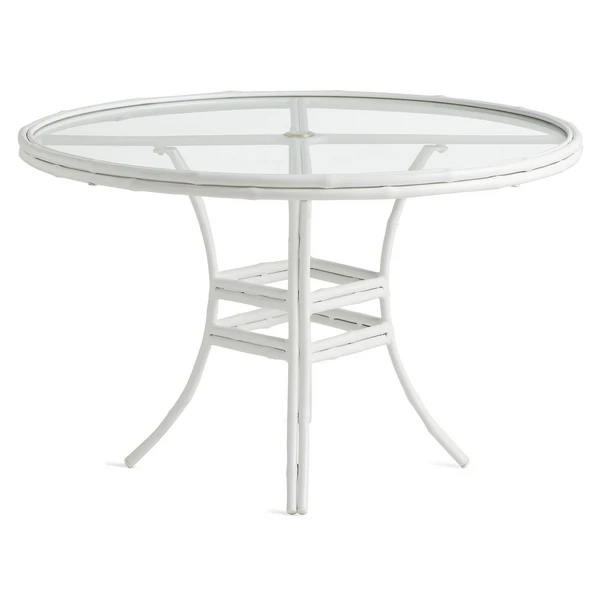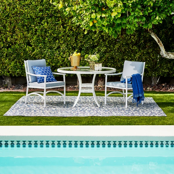 Pairing bamboo-style powder-coated aluminum framework in chalk white with sleek tempered glass surfaces and amply filled, all-weather cushions in chambray blue, the pieces in our Savannah Collection deliver a refined, tropical vibe to any outdoor space.