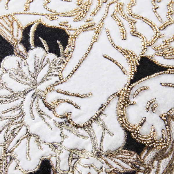 Featuring an embroidered chinoiserie motif and adorned with shimmering beads, this striking pillow will bring softness and style to any room.