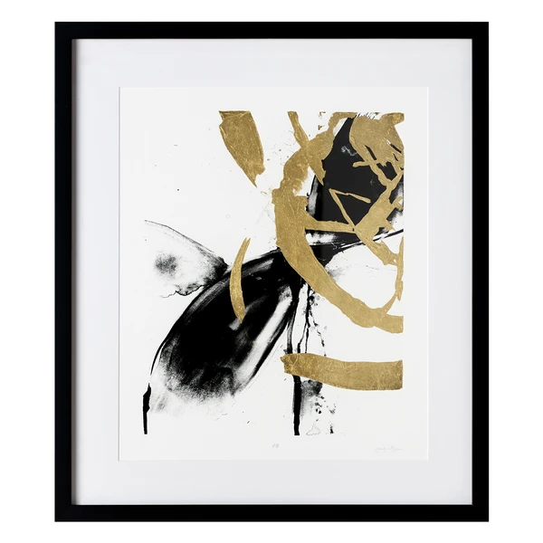 This limited-edition abstraction from artist Jennifer Goldberger is ideal for bringing a chic, modern note to your wall. Printed on archival paper with hand-embellished gold accents, this piece is displayed under glass in a black frame.