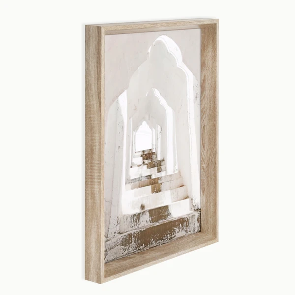 Stairway Up is a framed graphic under glass with a warm blonde frame.