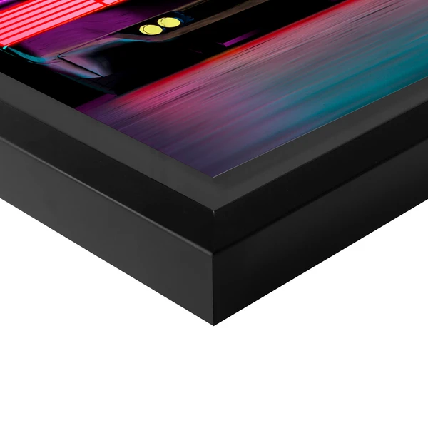 - Pedestal-mounted glossy art print is set off against a black mat, mounted within a high gloss black wood shadowbox frame, and set under plexiglass.