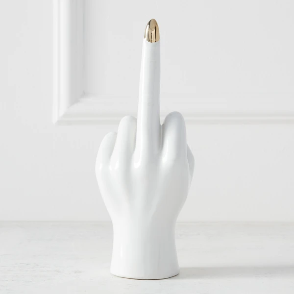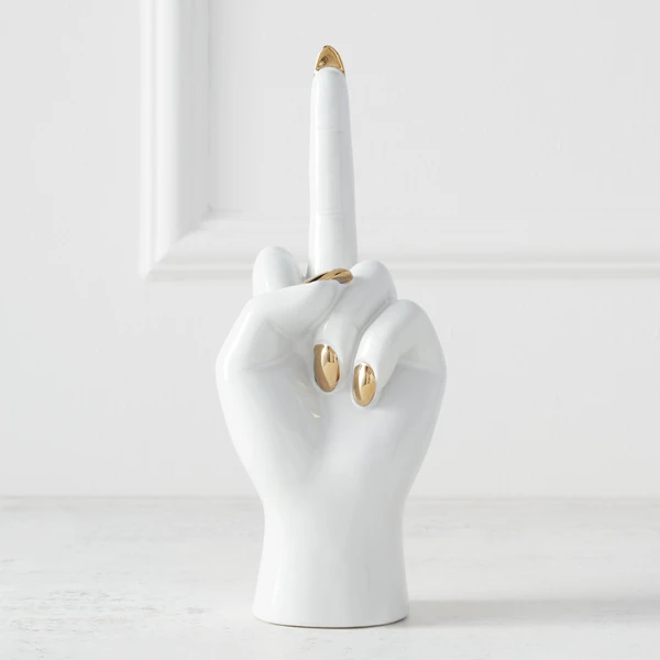 Crafted of ceramic with a glossy white and gold finish, this cheeky hand sculpture makes a stylish option for displaying jewelry (though we love it displayed on its own as well).