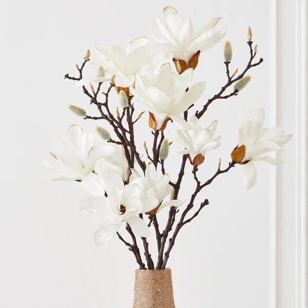 Faux magnolia blossoms make effortless floral arrangements. Pliable wired stems allow for flexibility in arranging.