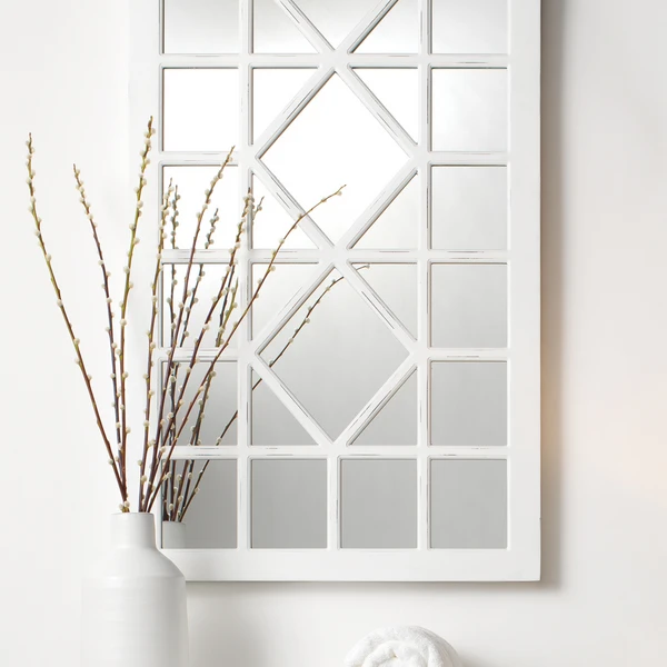 Our Virginia Mirror is extremely versatile. This grid mirror has an distressed white finish which can compliment any décor.
